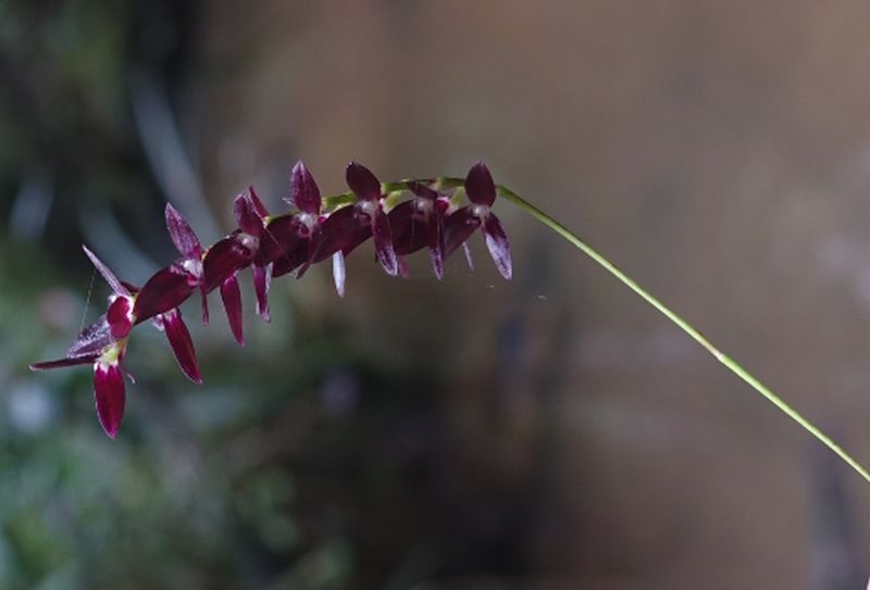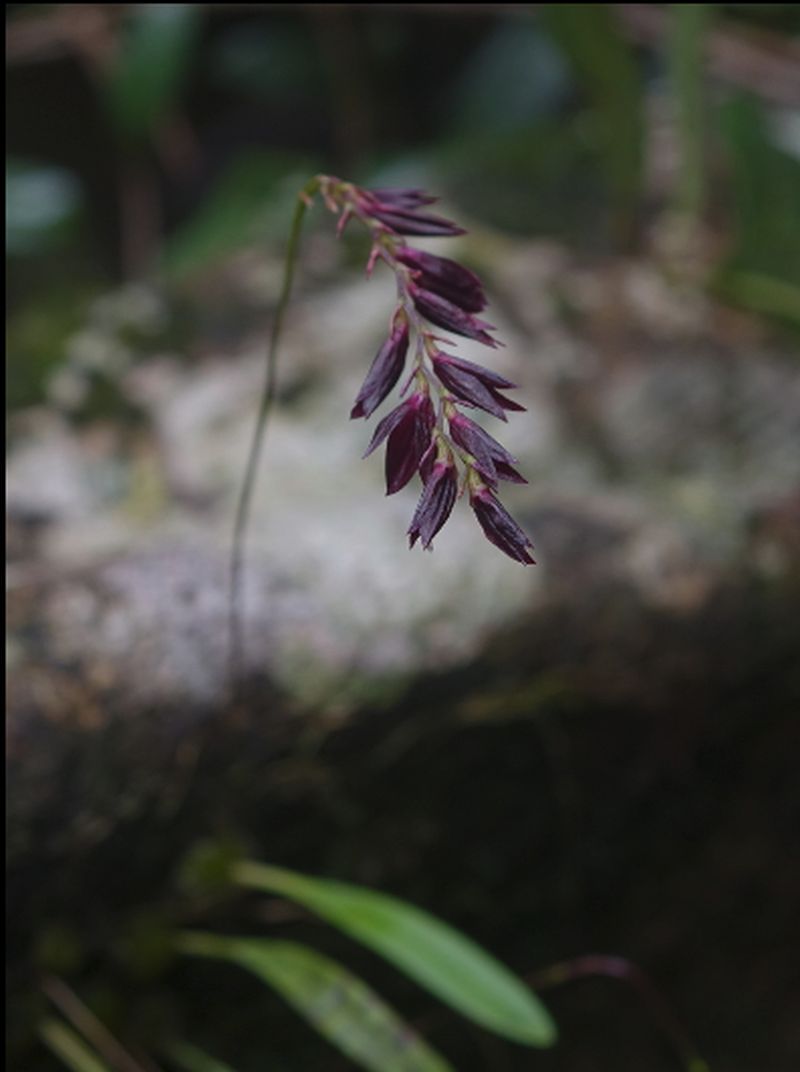 Found in Madagascar in mossy forests at elevations of [1000]1200 to 2000 meters as a mini-miniature sized, cool growing epiphyte with depressed-orbicular pseudobulbs carrying a single, apical, slightly oblanceolate, attenuate rom the upper third to both ends , in a subobtuse angle apically, petiolate base leaf that blooms in the summer on an erect, peduncle rigid, filiform, 4.8 to 6" [12 to 15 cm] long, provided with 4 to 5, thin, narrowly adpressed sheaths, to 8" [20 cm] long overall, rachis 1.6 to 2.8" [4 to 7 cm] long, very loose, 14 to 22 flowered inflorescence with oval-obtuse, as long as the pedicel floral bracts.