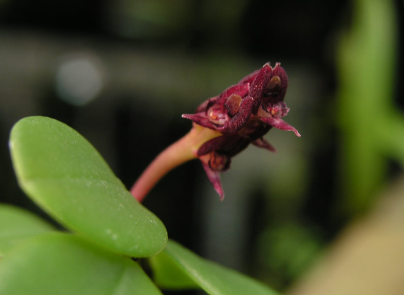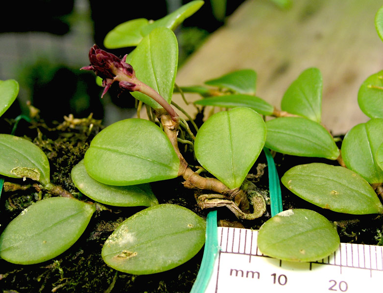 Found in penninsular Malaysia, Singapore and Sabah Borneo in lowland to hill forests at elevations of 700 to 800 meters as a mini-miniature sized, warm growing epiphyte with a creeping rhizome with .2" to 1/2" [.5 to 1.2 cm] between each miniscule, ovoid, not flattened pseudobulb carrying a single, apical, erect, coriaceous, elliptic, dark green, usually suffused with red, abruptly narrowing into the almost non-existent petiolate base leaf that blooms in the late summer on a .65" [1.6 cm] long, to 6 flowered inflorescence with faintly fetid smelling flowers