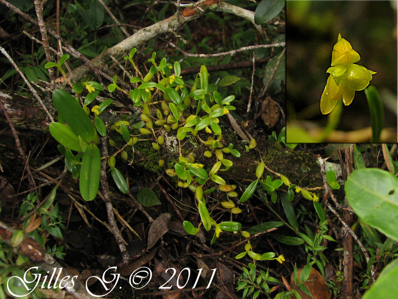 Found in north and northwestern Madagascar in dry or humid, evergreen forests on plateau at elevations around 700 to 1600 meters as a mini-miniature sized, warm to cool growing epiphyte with .6 to 1.4" [1.5 to 3.5 cm] between each oblong pseudobulbs carrying 2 apical, oblong leaves that blooms in the summer and mid fall on a basal, erect, subcapitate, short, 3 to 10 flowered inflorescence.