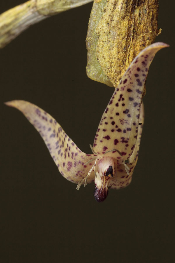 Found in Sulawesi in montane forests at elevations of 1200 to 1400 meters as a mini-mniature sized, cool growing epiphtye with a pendulous, sparsely branched rhizome with .6 to 1.4" [1.5 to 3.5 between each ovoid to almost cylindrical, obtusely 4 angled pseudobulb carrying a single, thin, ovate, acute to acuminate leaf that blooms on a short, peduncle to .16 to .2" [4 to 5 mm] long, to .6" [1.5 cm] long, single flowered inflorescence with acute floral bracts.