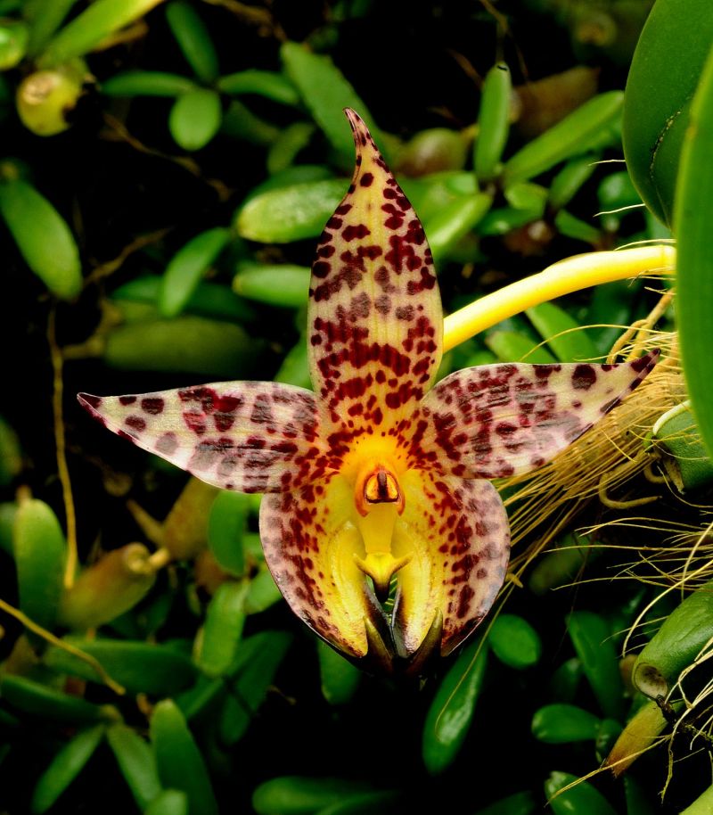 Found in Kalimantan Borneo in lowland rainforest at elevations around 200 to 300 meters as a small sized, hot growing epiphyte with 1 to 2.2" [2.5–5.5 cm ] between each distant, ovoid pseudobulb carrrying a single, apical, erect, coriaceous, ellitic to obovate, obtuse, petiolate base leaf that blooms in the spring on 1 to 2, basal, erect, 2 to 2.3" [5 to 6 cm] long, peduncle .4 to .6" [1 to 1.5 cm] long and covered by 4 to 6 bracts, single flowered inflorescence with tubular, acute floral bracts