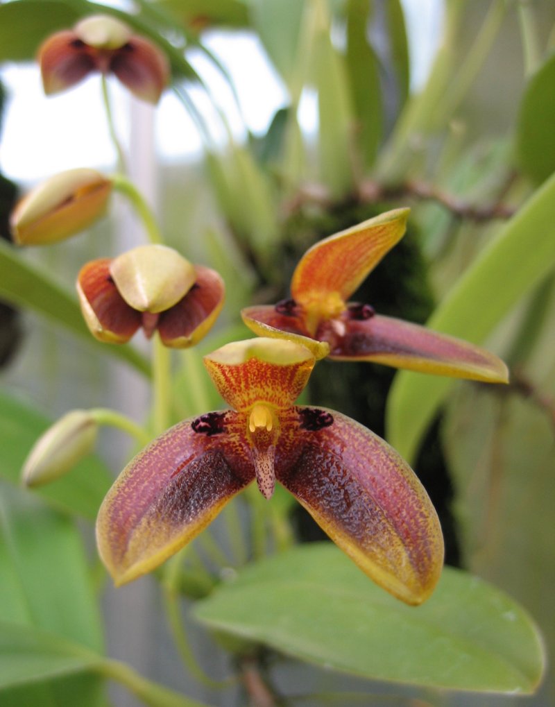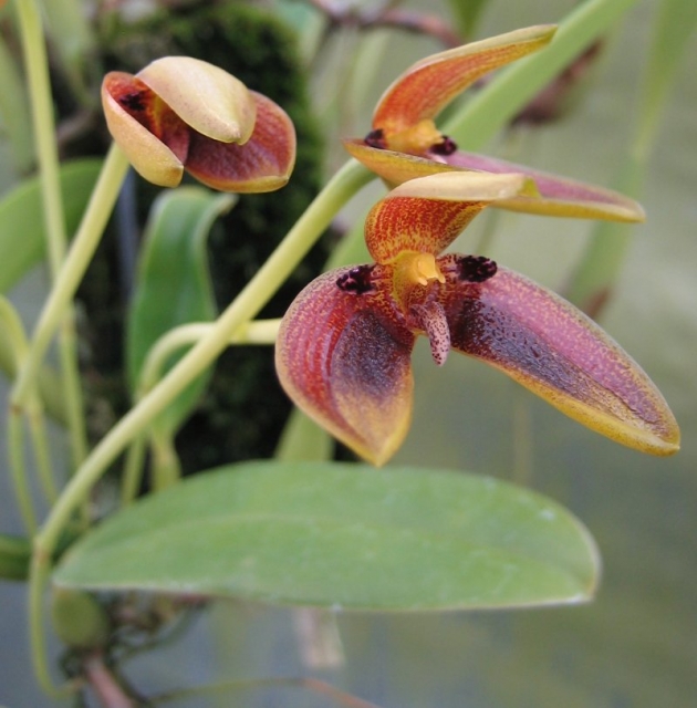 Found in New Guinea in forests on tree trunks at elevations around 700 meters as a miniature to small sized, warm growing epiphyte with narrowly conical pseudobulbs carrying a single, apical, erect, coriaceous, obliquely ligulate, subacute to minutely apiculate, narrowing below into the petiolate base leaf that blooms in the late winter and early spring on a shortly pedunculate, .6 to 1" [1.5 to 2.5 cm] long, single flowered inflorescence with very small, many times shorter than the very long pedicel floral bract.