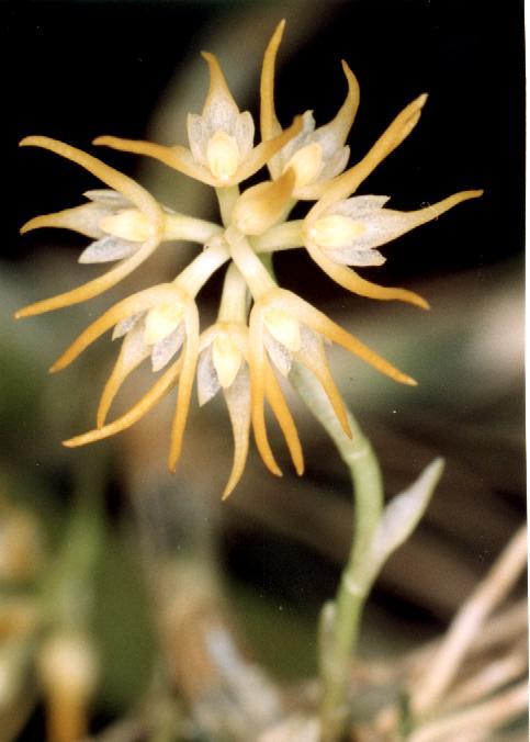 Found only in Thailand as a mini-miniature sized, hot to cool growing epiphyte with 1 to 1.6" [2.5 to 4 cm] between each cylindric, slender pseudobulb carrying a single, apical, elliptical, minutely retuse at the apex leaf and flowers in the fall on a very thin, rather lax, more or less subumbellate inflorescence.