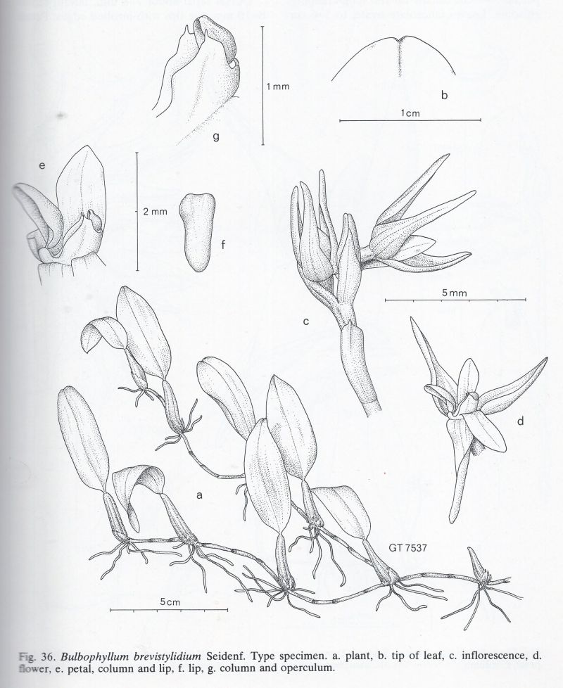 Bulbophyllum brevistylidium Seidenf. 1979 SECTION Desmosanthes [Bl.] J.J. Sm. 1933 Photos by Bob Fallon Copyright ©, and the Dr Leslie Garay Archives TYPE Drawing by © Seidenfaden Common Name The Short Column Bulbophyllum