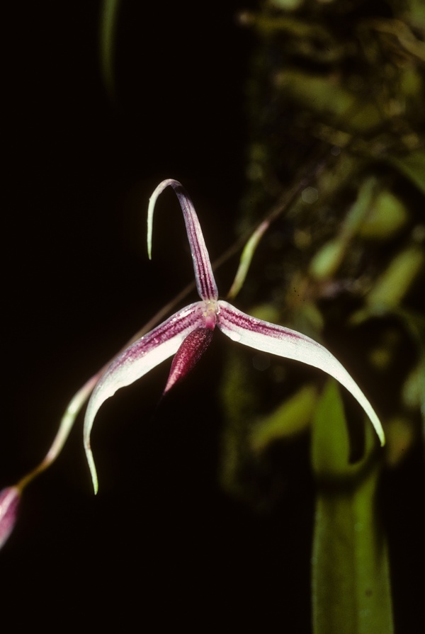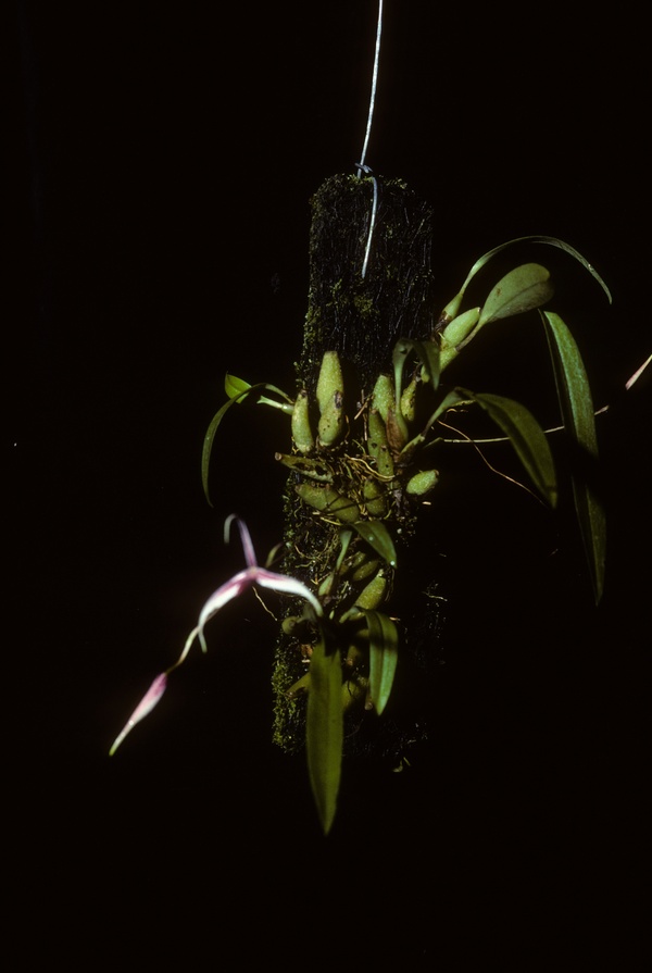 Found in New Guinea on trees in lower montane forests at elevations around 800 meters as a miniature sized, warm growing epiphyte with a short rhizome giving rise to close set, conical-cylindrical pseudobulbs carrying a single, apical, erect, coriaceous, glabrous, ligulate, obtuse to subobtuse, narrowing below intothe subpetiolate base leaf that blooms in the late summer and early fall on a basal, filiform, erect, 3.2 tpo 4" [8 to 109 cm] long, single flowered inflorescence elliptic-cucullate, apiculate, much shorter than the slender pedicellate ovary floral bracts.