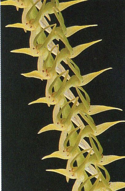 Found in Rwanda and Zaire in montane forests at elevations of 1900 to 2100 meters as a miniature to small sized, cool to cold growing epiphyte with a cylindrical rhizome with .72" to 3.6" [1.8 to 9 cm] between each very narrowly ovoid, slightly to moderately flattened, 4 angled pseudobulbs carrying 2, apical, linear-lanceolate to linear, obtuse, emarginate, usually oblique, coriaceous rather thick, mid rib slightly prominent abaxially leaves that blooms in the winter and spring on an erect to patent, peduncle 3.6 to 6" [9 to 15 cm] long, occasionally swollen towards the apex, basally flattened, glabrous, 3 to 5 bracted, 5.2 to 11.2" [13 to 28 cm] long overall, rachis erect, terete to slightly swollen, slightly zig zag, bent, 2.6 to 5.6" [6.5 to 14 cm] long, glabrous, densely 15 to 26 flowered inflorescence with recurved, membraneous, keeled and glabrous abaxially floral bracts and carrying distichous, secund, many open simultaneously, partially open, yellow to greenish flowers.