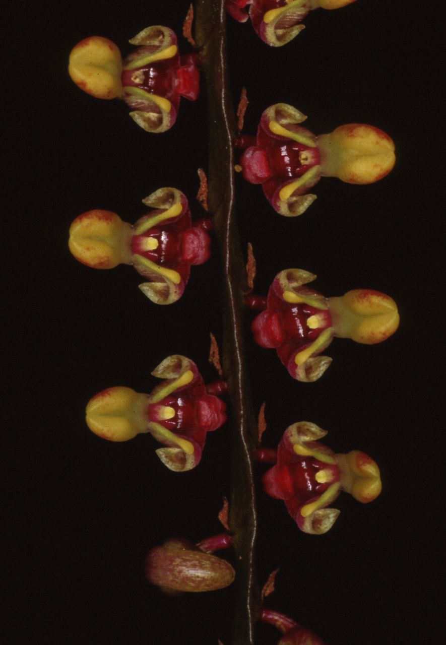 This variety is separated by the pendulous, blade like apex inflorescence that often flowers below the substrate of the plat and the flowers turned downwards towards the blade all the time