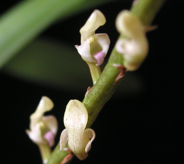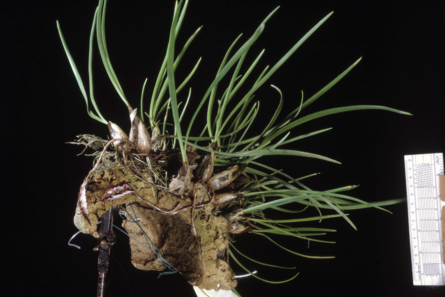 Found in Ghana, Guinea, Ivory Coast, Liberia, Nigeria, Sierra Leone, Togo, Cameroon, Congo, Equatorial Guinea, Gabon and Zaire at lower elevations to 1000 meters as a small to medium sized, hot to warm growing medium sized epiphyte with angled, somewhat compressed pseudobulbs carrying 2, apical, erect, coriaceous, narrow linear-lanceolate to narrowly linear, obtuse, emarginate, oblique leaves and blooms on an erect, spreading, wide, flat, 3' [90 cm] long, many flowered inflorescence with small, distichous flowers appearing on either side of the flattened rachis