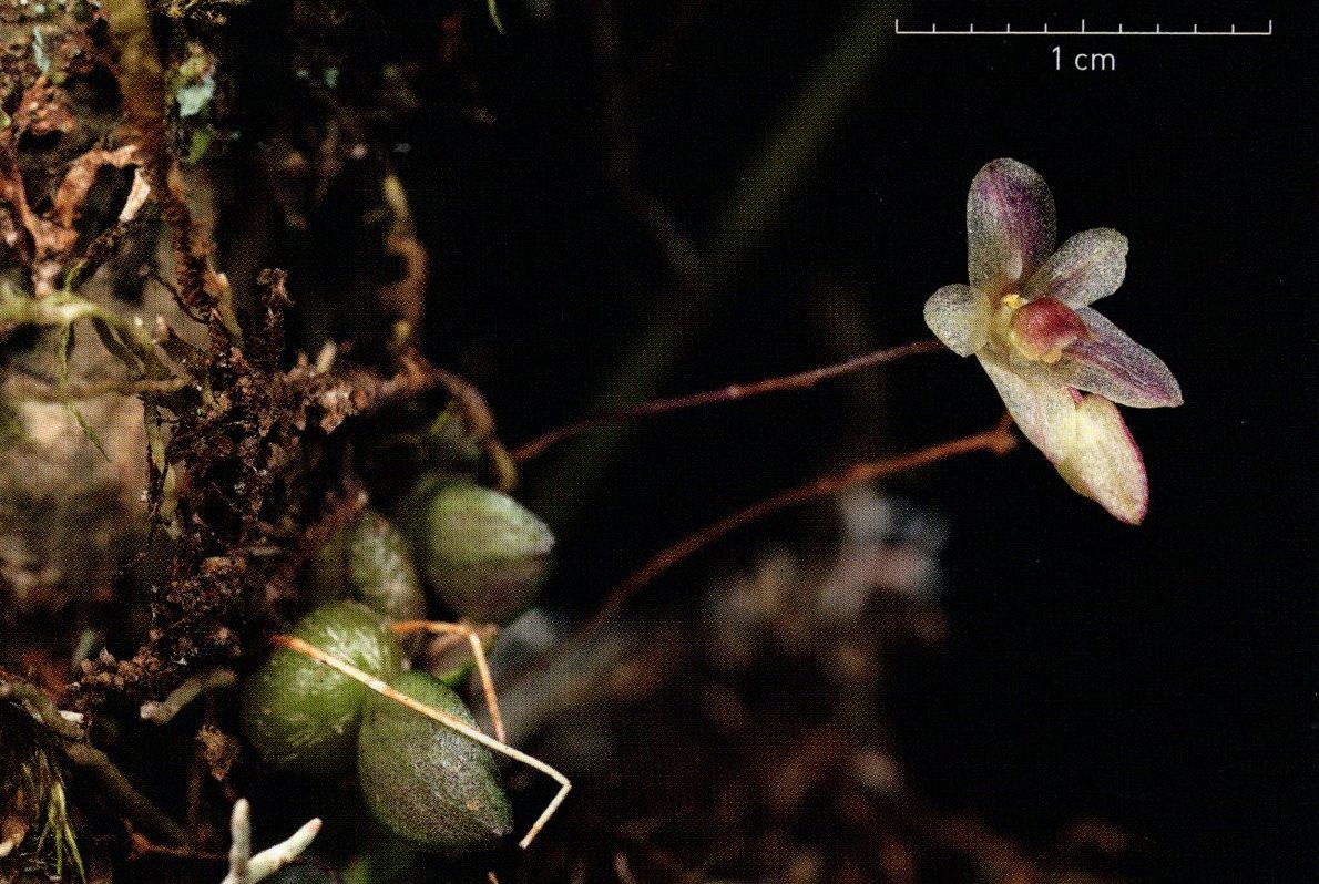 Found in northern Madagascar in lichen rich forests at elevations of 1000 to 2000 meters as a mini-miniature sized, cool growing epiphyte with .2 to .32" [5 to 8 mm] between each ovoid pseudobulb carrying a single apical, oblong, obtuse, shortly contracted-petiolate base leaf that blooms in the summer and fall on a basal, erect, setiform, carrying several small sheaths, .8 to 1.2" [2 to 3 cm] long overall, loosely 5 to 10 flowered inflorescence with widely oval-cucullate-apiculate, longer than the pedicel floral bracts and carrying an almost transparent flower.