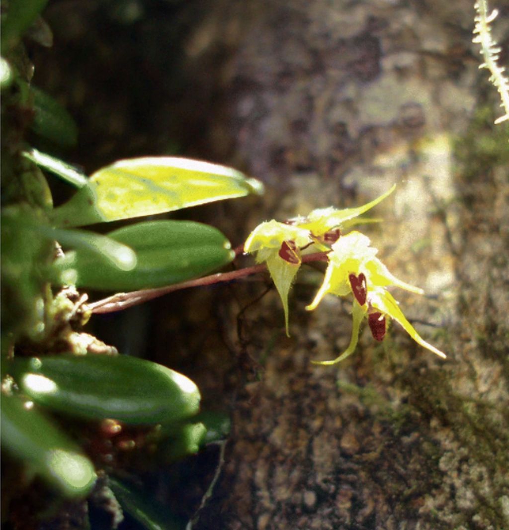 Found in southeastern and northeastern Madagascar in humid evergreen forest submerged in moss at elevations around 1000 meters as a mini-miniature sized, warm to cool growing epiphyte with a very short branching rhizome giving rise to partly overlapping, globose, compressed into a flattened rounded disk, pale green pseudobulbs carrying a single, apical, somewhat coriaceous, flat, obovate, arising in the center of the pseudobulb, tip emarginate, pale green, base narrowed into a short petiolate base leaf that blooms in the summer on an erect to arching, terete, emerging from beneath the pseudobulb, peduncle slender, reddish-brown, provided with 3 to 4 attenuate sheaths, rachis short, .16 to .24" [4 to 6 mm] long, red, c. .6" [15 mm] long overall, 1 to 3 flowered inflorescence with lanceolate-attenuate, slightly serrate at the tip, dark pink, shorter than the ovary floral bracts