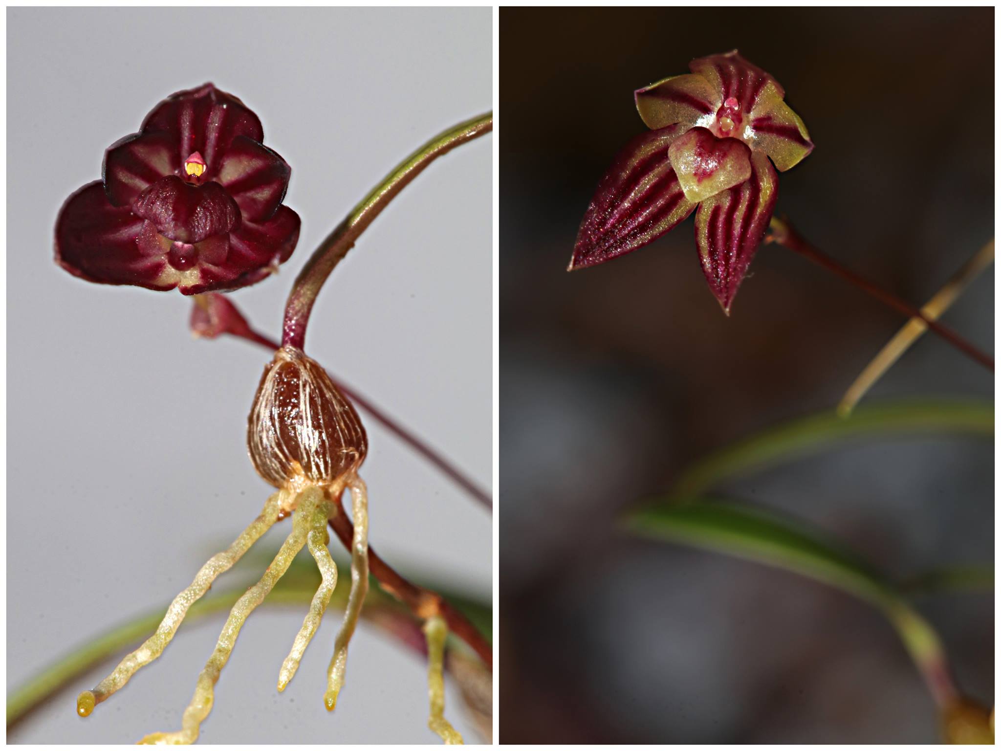 Found on the island of Negros in the Philippines at 1300 to 2300 meters as a miniature sized, cool to cold growing epiphyte with a long creeping , very slender, wiry, with .8 to 41.6" [2 to 4 cm] between each rounded, grooved pseudobulbs carrying a single, apical, erect, nearly sessile, elliptic-oblong, entire apically, very fleshy leaf that blooms in the spring on a slender, eret, to 1.8" [4.5 cm] long, single flowered inflorescence carrying a purple, carmine with yellow striped, bell shaped flowers.