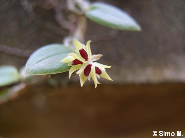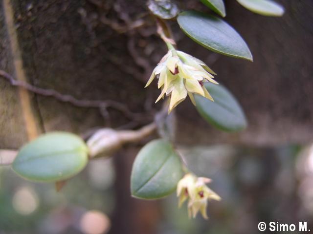Found in Gabon, Congo and Zaire in primary lowland forests as a mini-miniature sized, hot growing epiphyte with .28" to 1/2" [.7 to 1.2 cm] between each ovoid to orbicular, slightly flattened, obtusely 4 angled pseudobulbs carrying a single, apical, erect, coriaceous, thick, broadly elliptic to lanceolate, acute to shortly acuminate, either emarginate or not, not oblique, gradually narrowing below into the shortly petiolate base leaf that blooms on a basal, erect, wiry or not, glabrous, .6 to 2.4" [1.5 to 6 cm] long, 3 to 8 flowered inflorescence with 4 to 5, tubular, acute to acuminate, membraneous, nerveless, keeled abaxially bracts and recurved, elliptic to ovate, acute to acuminate, membraneous, not keeled abaxialy floral bracts.