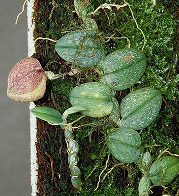 Found in eastern New Guinea in forests at elevations around 2200 meters as a miniature sized, cold growing epiphyte with a creeping rhizome giving rise to close set, prostrate, ellipsoid to ovoid, laterally flattened, white speckled, rugose with age pseudobulbs carring a single, ovate to almost round, white speckled, obtuse, shortly petiolate base leaf that blooms on a basal, prostrate, 1.6" [4 cm] long, peduncle with 2 bracts, single flowered inflorescence with an ovate floral bract and carrying a flower that is as large as the leaf