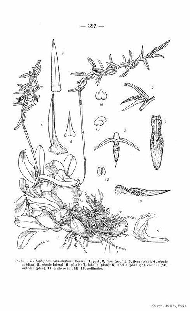 References W3 Tropicos, Kew Monocot list , IPNI ; * Adansonia n.s., 5: 396 Bossser 1969 drawing fide; Bulbophyllum cardiobulbum - The IUCN Red List of Threatened Species Simon Verlynde, Brigitte Ramandimbisoa & Tariq Stévart 2018 ; Novon 19:349 Rchb.f. ex G.A.Fisch. & P.J.Cribb 2009 Description of Four New Species of Bulbophyllum (Orchidaceae) from Madagascar; Orchids of Madagascar Hermans, DuPuy, Cribb & Bosser 2007; Field Guide to the Orchids of Madagascar Cribb & Herman 2009; Les Orchidees de Madagascar Bosser & Lecoufle 2015 photo fide;