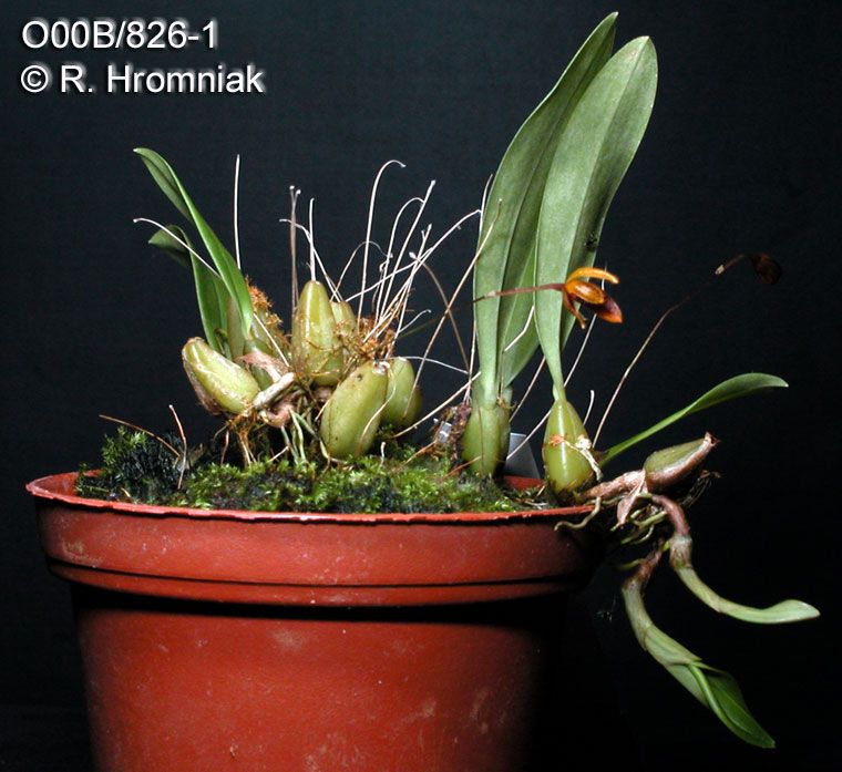 Found in the Philippines at elevations around 1000 to 1800 meters as a miniature sized, warm to cool growing epiphyte and occasional lithophyte with crowded, squarish to ovate-conical, slightly compressed and grooved pseudobulbs carrying a single, apical, leathery, lanceolate, very shortly petiolate base leaf that blooms on an erect, to 2" [to 5 cm] long, very thin inflorescence with small acute bracts and has the single flower held above the leaves.