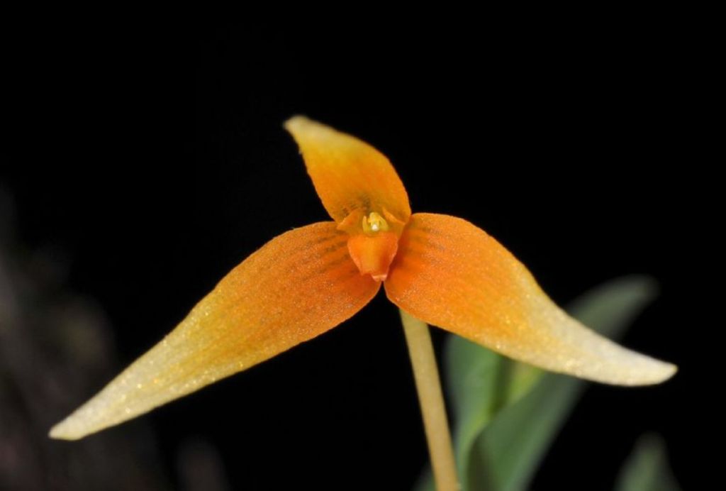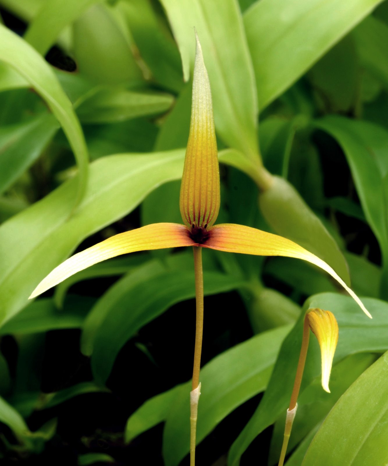 found in Thailand, Borneo and Java at altitudes around 610 to 1850 meters in dry open ridge forests as a mini-miniature sized, warm to cool growing epiphyte with a creeping rhizome, carrying close set, ovoid, somewhat flattened pseudobulbs enveloped basally with many stiff hairs and carrrying a single, apical, rather thick, elliptic, petiolate leaf that blooms in the fall on a lateral, slender, .8" to 2.8" [2 to 7 cm] long inflorescence carrying an apical, solitary, unscented, slightly nodding flower.