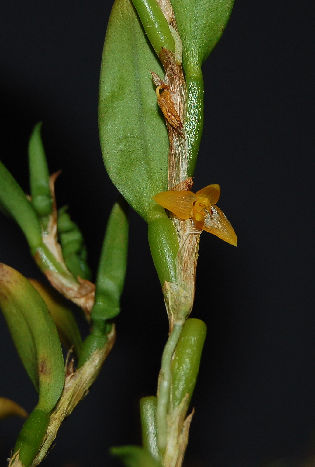 Found in Papua New Guinea in upper montane forests at elevations of 2100 to 2300 meters as a medium sized, cold growing epiphyte with .24 to .4" [.6 to 1 cm] between each porrect, distant, cylindrical-obovoid pseudobulb with the new shoot arising 5 to 7 mm from the base of the pseudobulb, about half-way along its length and carrying a single, apical, erect, ovate, acute, gradually narrowing below into the petiolate base leaf that blooms on a basal, 1/2" [1.25 cm] long, single flowered inflorescence with a tubular, acute floral bract