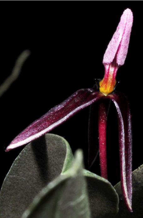 Found in New Guinea on trees in lower montane forests at elevations around 600 to 1000 meters as a mini-miniature sized, warm growing epiphyte with a short, creeping rhizome giving rise to crowded, subovoid-cylindrical pseudobulbs carrying a single, apical, erect-patent, narrowly oblong-ligulate, coriaceous, glabrous, gradually narrowing below into the subpetiolate base leaf that blooms in the spring through summer on numeros, from the rhizome, erect, slender, filiform, terete,glabrous, 1.3 to 1.6" [3 to 4 cm] long, provided with a few small, well spaced sheaths, single flowered inflorescence with ovate-lanceolate, acuminate, glabrous, much shorter than the slender, pedicellate ovary floral bracts.