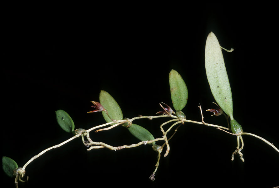 Found in Java and Sulawesi in the dense understory of montane forests at elevations of 1900 to 2000 meters as a mini-miniature sized, cool growing epiphyte with .32 to 1.52" [.8 to 3.8 cm] between each, distinct, obliquely erect, ovoid, grooved pseudobulb carrying a single, apical, erect, elliptic to obovate, acute-mucronate, gradually narrowing below into the shortly petiolate base leaf that blooms in the winter on a basal, .6 to .8" [1.5 to 2 cm] long, single flowered inflorescence with acute floral bracts.