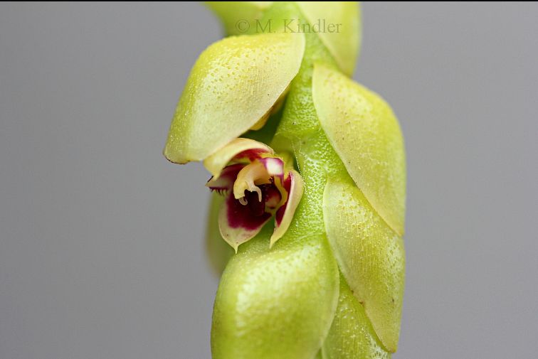 Found in Madagascar in evergreen forests on plateau at elevations of 900 to 1200 meters as a mini-miniature sized, warm to cool growing epiphyte with compressed-discoid pseudobulbs carrying 2, apical, lorate leaves that blooms on a basal, erect, 8" [ 20 cm] long, conical, flowers sunk into three rows on rachis, many flowered inflorescence with large, longer than the flowers floral bracts.