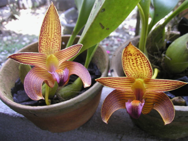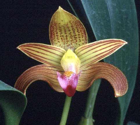 Found in northeastern Borneo in mmoxed tall forests at elevations of 800 to 1000 meters as a small to medium sized, warm growing epiphyte with a creeping rhizome with 1 to 1.2" [2.5 to 3 between each distinct, ovoid to ellipsoid pseudobulb carrying a single, apical, erect, ellptic to ovate to obovate, obtuse, petilate base leaf that blooms on an erect, 4 to 6.4" [10 to 17 cm] long, single flowered inflorescence