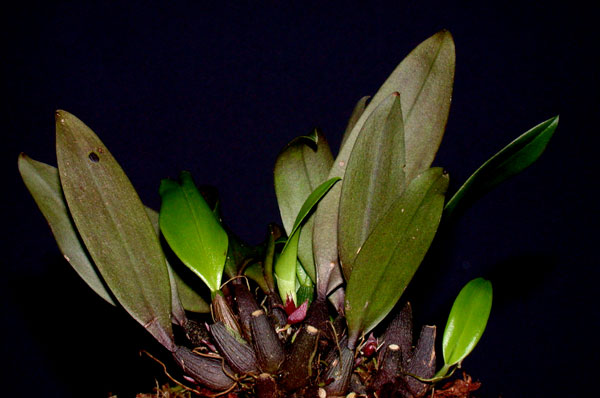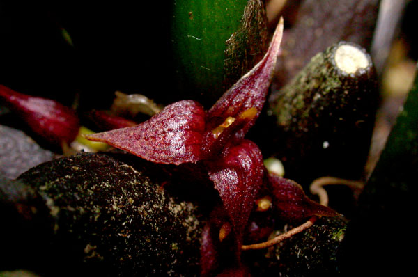 Found in New Guinea and Sulawesi in primary mist forests on moss covered limbs of large trees at elevations of 1000 to 1200 meters as a miniature sized, cool growing epiphyte with close set, conic-cylindical pseudobulbs carrying a single, apical, erect, ligulate, acute to apiculate, cuneate below into the base leaf that blooms in the late spring and summer on a 1/2” to .6” [1.2 to 1.5 cm] long, single flowered inflorescence with very small, shorter than the subsessile ovary floral bracts and holding the flower close to the pseudobulb.