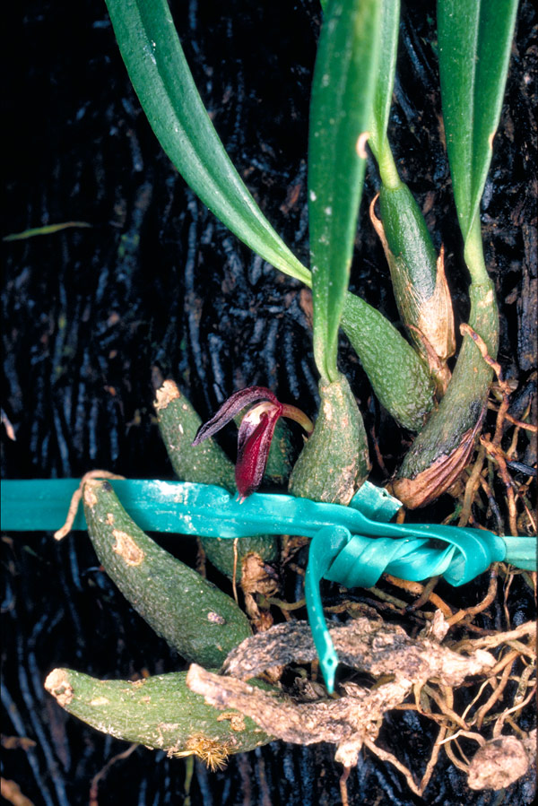 Found in New Guinea on hills at elevations around 400 to 900 meters as a mini-miniature sized, hot to warm growing epiphyte with a short rhizome giving rise to ovoid-conic pseudobulbs carrying a single apical, erect, glabrous, narrowly linear, acute to apiculate, attenuate below into the base leaf that blooms in the late summer through fall on a very short, single flowered inflorescence with an ovate-cucullate, distinctly shorter than the ovary floral bract