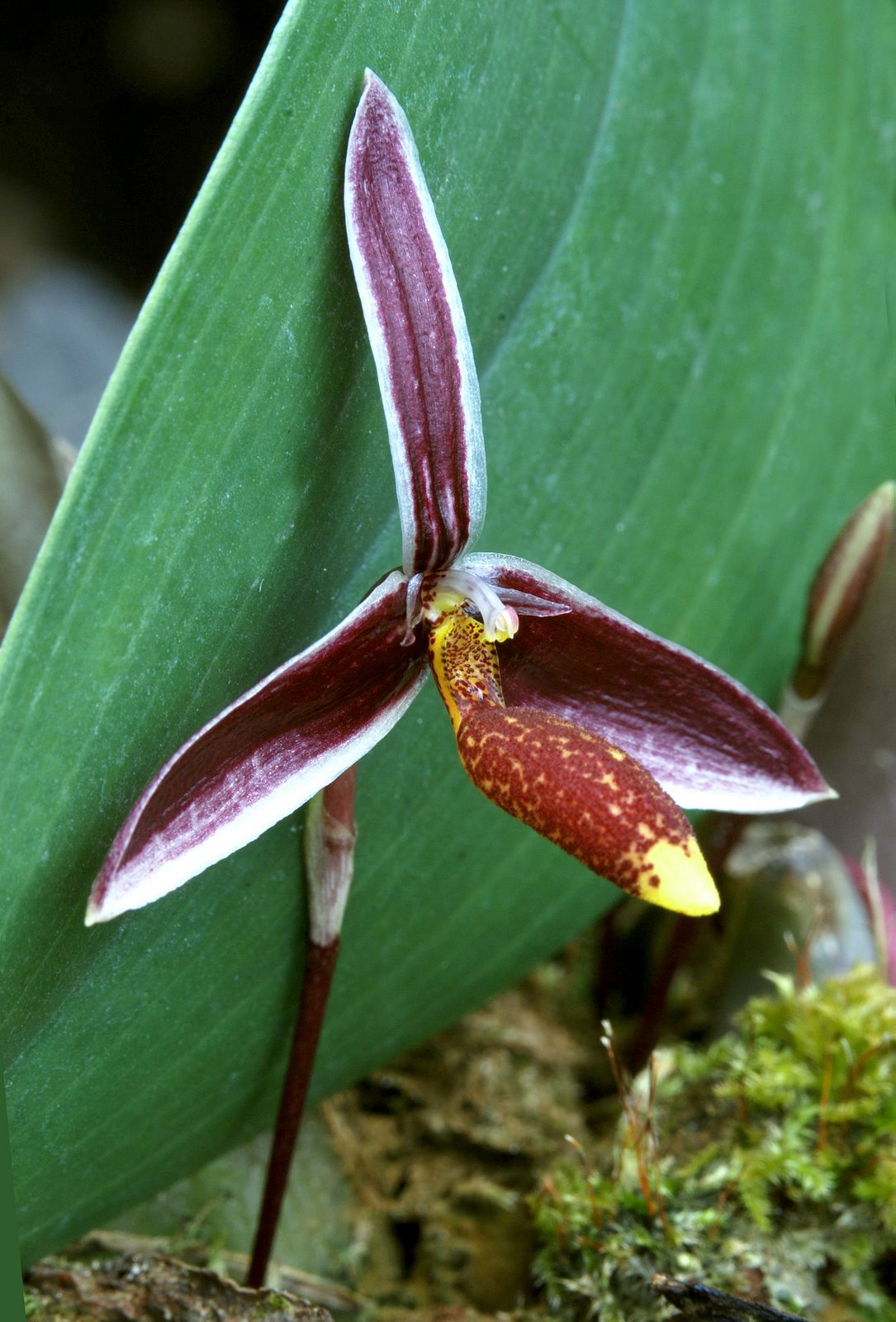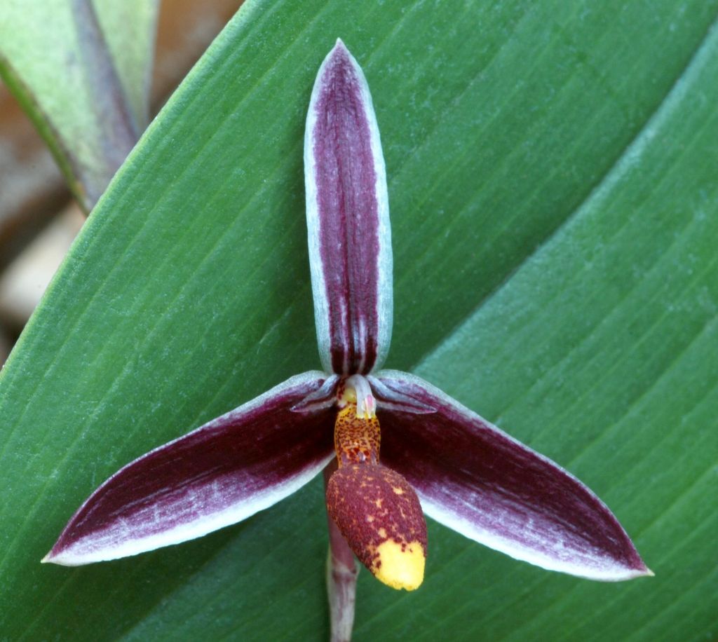 Found in New Guinea on mossy covered tree limbs in the coastal plains under 500 meters in elevation as a small sized, hot growing epiphyte with close set, in two rows, initially enclosed by tubular sheaths, erect, ovoid, opaque green, suffused with dirty violet, with a wide longitudinal groove, later longitudinally multigrooved pseudobulbs carrying a single apical, erect, lanceolate, subopaque, dark green, narrowed part dirty violet, acute, thick coriaceous, rigid, laterally compressed, in cross-section elliptic, margins acute? abruptly? recurved; midrib above grooved, underneath slightly prominent, obtuse, long narrowed below into the petiolate base leaf that blooms at most anytime of the year on arising from the nodes of the rhizome, peduncle, dark purple, more slender than the pedicel, .48" [1.2 cm] long, provided at the base with a few overlapping, subulate-acuminate sheaths, single flowered inflorescence with tubular, subulate, acuminate, greenish keel and apex keeled floral bracts.