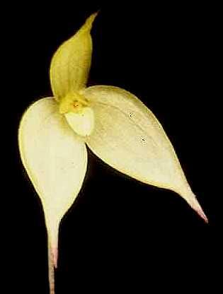Found in Papua New Guinea at elevations of 3000 meters as a unifoliate, cold growing epiphyte that blooms on a 2" [5 cm] long inflorescence carrying a single flower held at or just above leaf height.