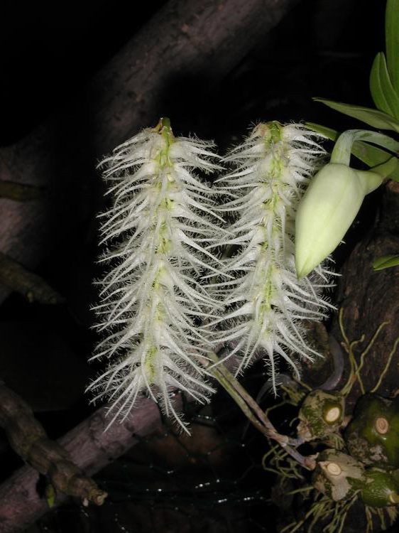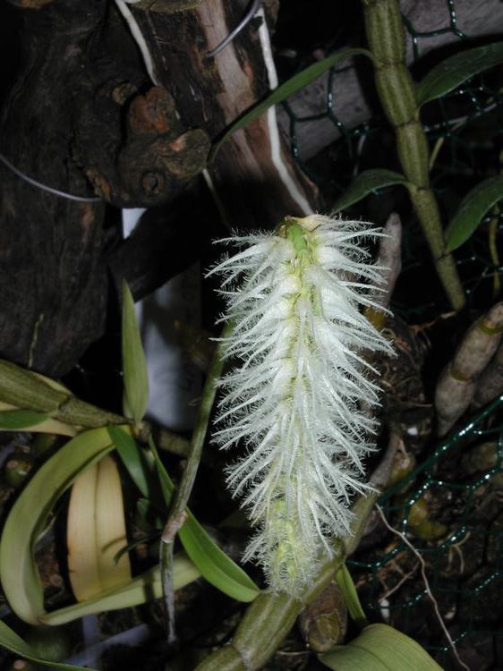 Found in India, Thailand, Myanmar and Vietnam? at elevations of 1850 to 2000 meters as a small sized, cool growing epiphyte with terete pseudobulbs carrying two apical, papery deciduous leaves that fall just before blooming which occurs in the winter on a thick, 10" [25 cm] long, pendant to erect, densely many flowered, cylindrically racemose inflorescence carrying dangling, hirsute, fragrant [cinnamon] flowers.