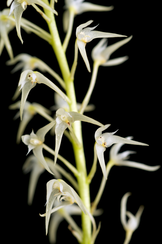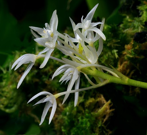 Found in Sumatra, Java, Borneo and Sulawesi in lowland and hilly montane forests on main branches of large trees at elevations of 100 to 600 meters as a small to medium sized, hot to warm growing epiphyte with a creeping rhizome with 2 to 5.2" [5 to 13 cm] between each obovoid, flattened pseudobulb and carrying a single, apical, erect, rather thin, elliptic, medium green, abruptly narrowing below into the petiolate base leaf that blooms in the later summer on a basal, erect, 3.8 to 6.4" [9.5 to 16 cm] long, 18 to 30 flowered inflorescence with ovate to triangular floral bracts and carrying spicely fragrant flowers.