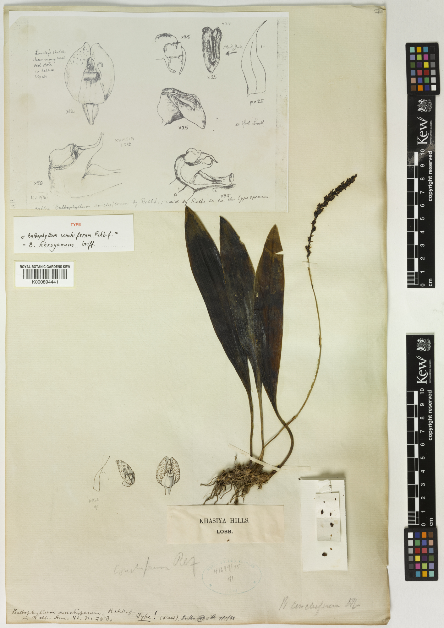 "B. conchiferum undeservedly regarded as a synonym of B. khasyanum (Pearce & Cribb 2002), which type specimen has short, almost head-like spike. Inflorescence and flowers of B. ustulata fits well the excellent analytical drawing presented on type herbarium specimen of B. conchiferum stored at K [K000894441] in elongate rachis, dense, shell-like sessile flowers, acuminate, revolute apex of median sepal, acuminate recurved petals, 2-keeled lip and long stelidia." Averyanov etal 2018