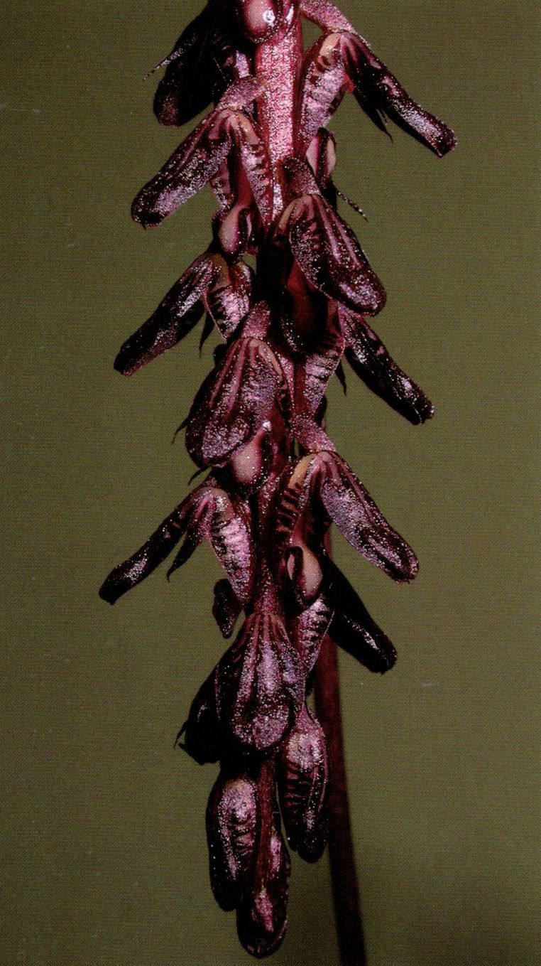 Found in Sulawesi in montane forest on steep slopes at elevations of 1200 to 1400 meters as a mini-miniature sized, cool growing epiphyte with a creeping rhizome enveloped by not persistent rhizome scales with .32 to .48" [.8 to 1.2 cm] between each clustering, ovoid, round in crossescton pseudobulbs carrying a single, apical, erect, elliptic, acute, petiolate base leaf that blooms in the late fall and winter on an erect to patent peduncle ca 4" [10 cm] long, , bracts ca 4, the longest ca 8 mm long, rhachis nodding at the base, pendulous, not thickened, ca 1.46" [3.6 cm] long, rather dense ca 5.6" [14 cm] long, many open simultaneously, ca 18 flowered inflorescence with triangular, acute, shorter than the ovary floral bracts and carrying not resupinate, not fully opening flowers with whitish near the base sepals, with thick, blackish purple lines over the veins, entirely blackish purple near the top, petals whitish near the base, increasingly stained blackish purple towards the top and a whitish lip with the margins stained with blackish purple.