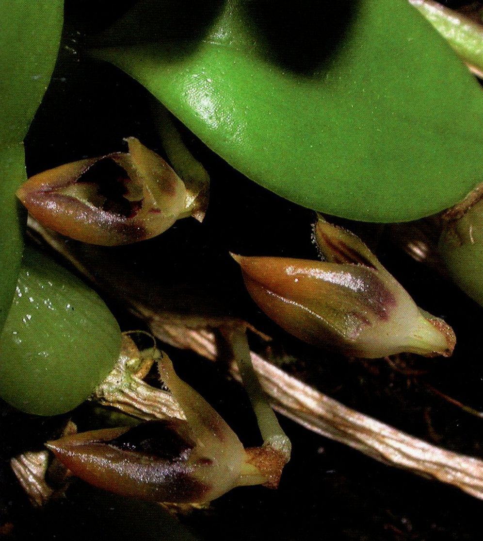 Found in Sulawesi in low, dense, very wet montane forest in moss cushions at elevations of 1600 to 2200 meters as a mini-miniature sized, cool to cold growing epiphyte with a creeping to shortly straggling rhizome with 1.6 to 2" [4 to 5 cm] between each, erect, ovoid pseudobulb carrying a single, apical, erect, ovate, acute, narrowing below into the petiolate base leaf that blooms in the winter on a porrect, peduncle ca .24 to .36" [.6 to .9 cm], provided with bracts, raceme .56" [1.4 cm] long overall, single flowered inflorescence with a tubular, acute, shorter than the ovary floral bract and carrying flowers do not fully open with the median sepal and petals dull purple, the lateral sepals similar but pale yellow along lower margin ana a purple lip.