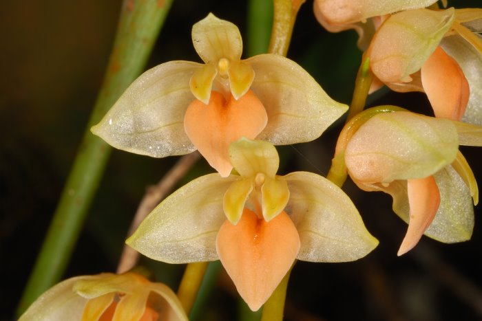 Found only in Borneo at elevations around 400 to 1200 meters as a mini-miniature to medium sized, hot to cool growing epiphyte or occasional terrestrial with .8 to 4.4" [2 to 11 cm] between each minute, discoid, not laterally flattened pseudobulb carrying a single, apical, erect, elliptic to ovate, obtuse to acute, sometimes cordate, petiolate base leaf that blooms in the summer on an erect to patent, often somewhat arching, elongate, peduncle .78 to 6" [1.8 to 15 cm] long, lax, 1 to 12" [2.5 to 30 cm] long overall, [1] 2 to 12 flowered inflorescence.