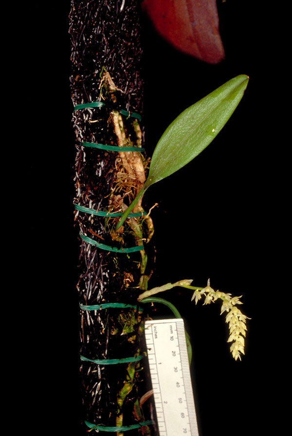 Found in Sabah and Sarawak Borneo in hill, lower and upper montane forests at elevations of 600 to 3500 meters as a small sized, warm to cold growing epiphyte or lithophyte with a creeping rhizome with 2.4" [6 cm] between each, small, globose pseudobulb carrying a single apical, erect, elliptic, acute, gradually narrowing below into the petiolate base leaf that blooms on a basal, 4" [10 cm] long, many flowered inflorescence carrying sweetly fragrant flowers.