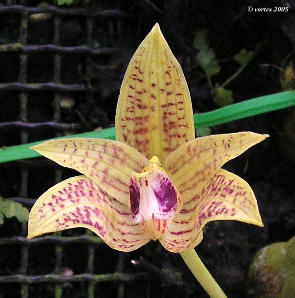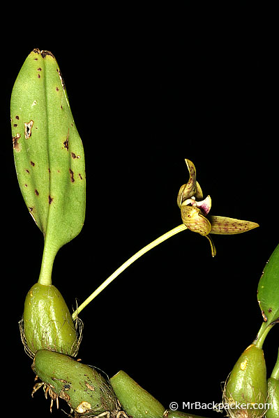 Found in Laos near the Thai Border and central Vietnam at elevations of 800 to 1500 meters as a small sized, warm to cool growing epiphyte with a creeping, woody rhizome giving rise to adpressed to the rhizome, close set, ellipsoid, slightly ribbed pseudobulbs carring a single, apical, erect, elliptic-lanceolate leaf that blooms in the spring on a basal, erect to patent, provided with with 2 to 3 bracts, ,4 to .48" [1 to 1.2 cm] long, single flowered inflorescence with tubular, shorter than the ovary floral bracts.