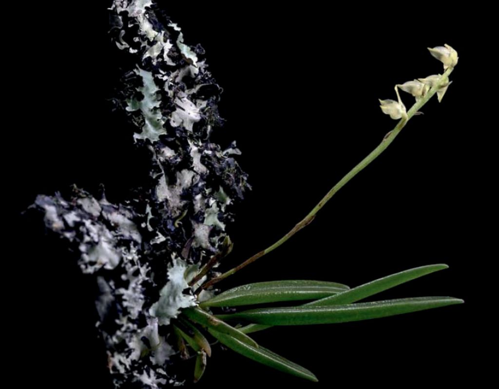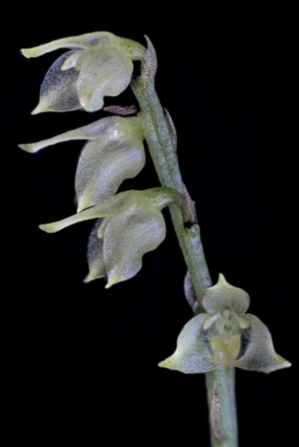 Found in the Philippines on Mindanao Island on mossy branches at elevations around 1200 meters as a mini-miniature sized, cool growing epiphyte with erect, clustered, globose pseudobulbs with cylindrical internodes and enveloped by dried cataphyls carrying a single, linear-lanceolate, glabrous, grooved, semi terete, fleshy, acute-acuminate, acute basally, glabrous, margin entire leaf that blooms in the late winter and early spring on an axillary, erect, peduncle accicular, .18" [4.5 mm] long, rachis to 2.4" [6 cm] long, to 6 flowered inflorescence with triangular, persistent, glabrous, green, as long as the ovary floral bracts and carrying resupinate, non fragrant flowers.