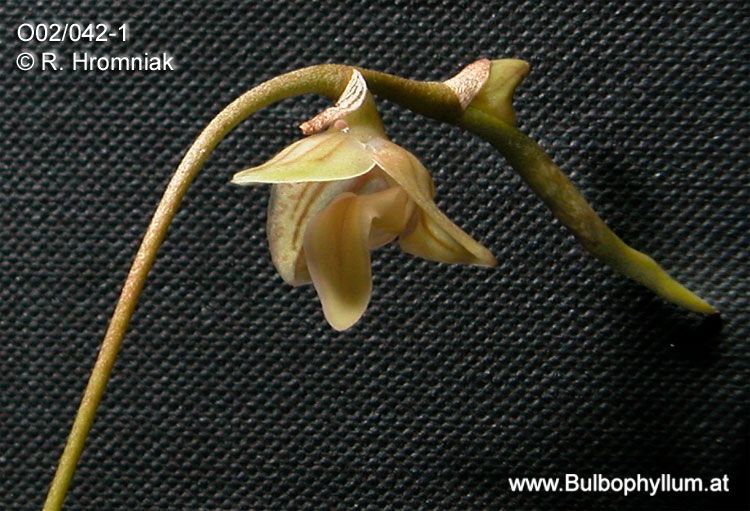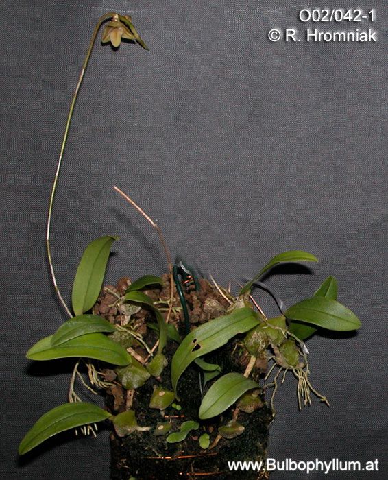 Found in eastern Brazil at elevations of 1000 to 1600 meters as a mini-miniature sized, cool growing epiphyte or lithophyte with a creeping, branching, woody rhizome with .4" [1 cm] between each conical to ovoid, rugose, light green pseudobulbs carrying a single, apical, erect, elliptic, acute, basally clasping leaf that blooms in the late fall through late spring on a basal, erect, wirey, 7.2" [18 cm] long overall, rachis at an angle to the inflorescence, to 2.8" [7 cm] long, few to several [to 10] flowered inflorescence with the successively opening flowers held towards the apex and has 2, linear, acute bracts.