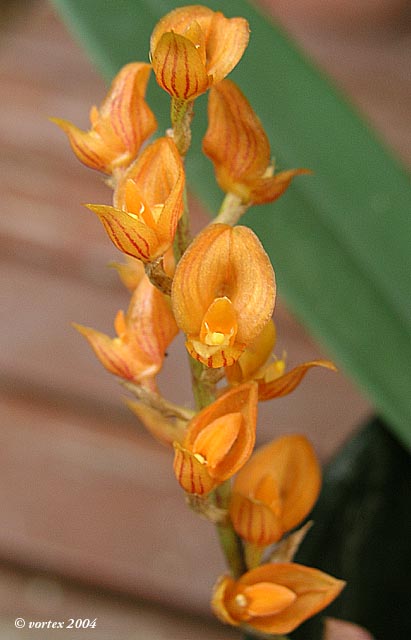 Found in Myanmar, the Malay pennisula and the Philippines as a small sized, hot to cool growing epiphyte at elevations around 500 meters on tree trunks with basally paper covered, ovate, fleshy pseudobulbs carrying a single, apical, leathery, oblong to elliptic leaf that blooms in the fall on a 5 1/2" [14 cm] long, slender, pendant, lax raceme with 4 equally spaced bracts and carrying several [20], foul smelling flowers.