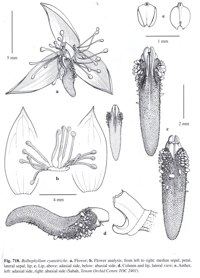 " Bulbophyllum epicrianthes Hook. f. is most similar; B. cyanotriche differs in having distinctly spathulate appendages along the petals, as well as in having an obtuse lip." J J Vermeulen 1996