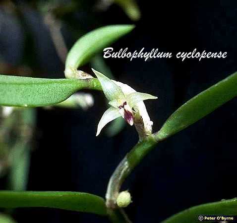 Found in Papua and New Guinea and Irian Jaya on smooth-barked tree trunks occuring in seasonally flooded swamp forests at sea level as a mini-miniature sized, hot growing epiphyte with a scrambling, pendent rhizome with .18 to .34" [4.5 to 8.5 mm] between each, elongated, subterete, basal part long adnate to the rhizome, upper part appressed to the rhizome pseudobulbs that blooms in the late fall on a basal, 2" long, single flowered, greenish white inflorescence that holds the nonresupinate, short-lived, diurnal, delicate flower against the base of the pseudobulb.