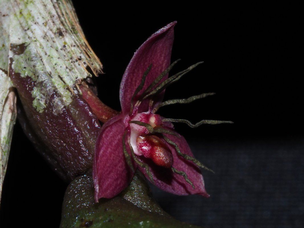 Found on Mindanoa island of the Philippines at elevations around 700 meters as a medium to large sized, warm, pendulous growing epiphyte with a branching rhizome enveloped by persistent, papery sheaths and giving rise at .4 to .8" [1 to 2 cm] long intervals, 4 angled, slightly copressed, oblong, brown with a purplish tinge, upper surface grooved basally pseudobulbs and carrying a single, apical, ovate to oblong, involute margins, appearing tubular, distinctly grooved above, obtus apically, leathery, purplish brown above, dark green beneath leaves that blooms in the winter on a basal, successively single to 3 flowered inflorescence.