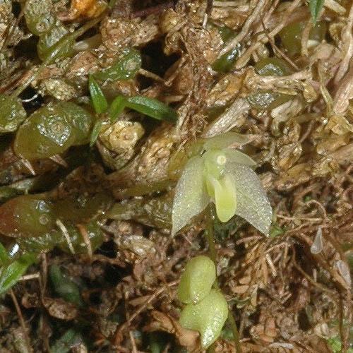 Found in east northeastern Madagascar in mossy and lichen rich forests at elevations of 900 to 1000 meters as a mini-miniature sized, warm growing epiphyte with a creeping rhizome giving rise to obliquely obovoid-cylindrical pseudobulbs carrying a few, small, in a tuft, lanceolate, acute leaves that blooms in the summer on a .6 to .8" [1.5 to 2 cm] long, single flowered inflorescence