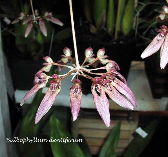 References W3 Tropicos, Kew Monocot list , IPNI ; The Orchids of Thailand Seidenfaden & Smitinand 1961; Notes on Cirrhopetalum Seidenfadden 1973 drawing fide; Dansk Botanisk Arkiv Bind 33 #3 Orchid Genera in Thailand VIII Bulbophyllum Thou Seidenfaden 1979 drawing good; The Orchids of Penninsular Malaysia and Singapore Seidenfadden & Woods 1992 drawing/photo ok; The Orchids of Penninsular Malaysia and Singapore Seidenfaden & Wood 1992 drawing hmm; Thai Orchid Species Rakpaibulsombat 1992 photo ok; Bulbophyllum and Their Allies Seigerist 2001 as Cirrhopetalum cyclosepalon; Bulbophyllum and Their Allies Seigerist 2001 as Cirrhopetalum dentiferum photo fide; A to Z of SE Asian Orchids O'Byrne 2001 photo fide; A field Guide to the Wild Orchids of Thailand Vaddhanaphuti 2001 photo hmm; Flora Malesiana Orchids of the Philippines Vol I Agoo, Shuiteman and de Vogel 2003 as B dentiferum; A field Guide to the Wild Orchids of Thailand Vaddhanaphuti 2005 as Cirrhopetalum dentiferum photo okish; Bulbophyllum: the incomplete Guide From A to why? Bill Thoms 2009 photo fide; Wild Orchids of Penninsular Malaysia Ong, O'Byrne, Yong & Saw 2011 photo fide