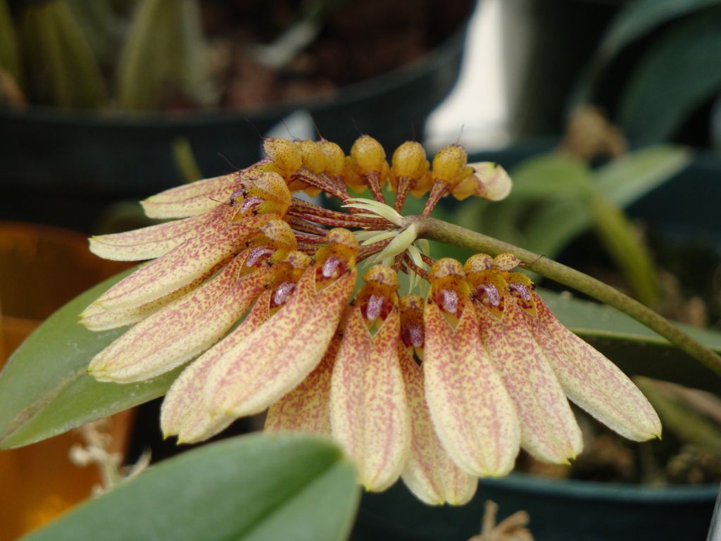 Found in Thailand, Malaysia and Java as a small sized, hot to warm growing, unifoliate, epiphytic species with woody rhizome with the conic, 4 angled, bright green pseudobulbs spaced apart by at least 3.2" to 5.6" [8 to 14 cm] and carries a single, apical, erect, fleshy, narrowly ovate, blunt-ended leaf that narrows below into a distinct 1" [2.5 cm] long, petiole and blooms in the fall and winter on a 3.2" to 8" [8 to 20 cm] long, several flowered inflorescence with the flowers held in an umbel at the apex of the scape, all held above the leaves.