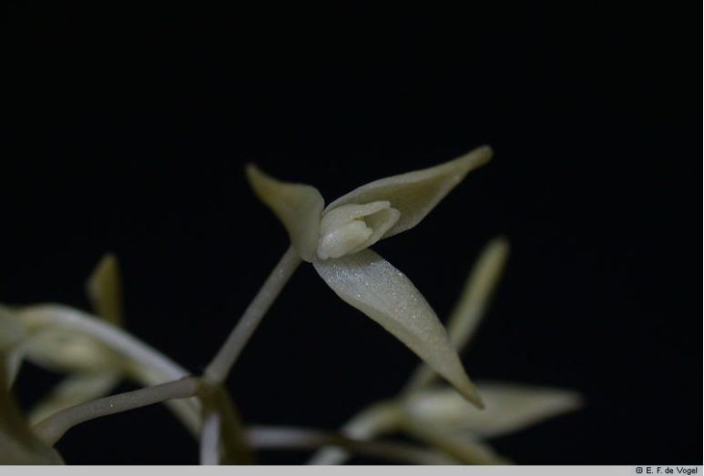 Found in New Guinea in primary and secondary forests at elevations around 200 to 2000 meters as a small sized, hot to cool growing epiphyte with an erect, pstent or pendulous rhizome with .24 to 5.6" [.6 to 14 cm] between each ovoid to ellipsoid not flattened, suberect pseudobulb carrying a single apical, suberect, ovate to elliptic, obtuse to acute, contracted below into the shortly petiolate base leaf that blooms in the late winter and spring on an erect, peduncle [.8 to 1.3 cm] long, 3 bracts, .52 to 1.6" [1.3 to 4 cm] long overall, rachis [.7 to 1.7 cm] long, densely, simultaneously many, 5 to 20 flowered inflorescence with triangular, acute floral bracts and carrying moderately opening flowers.