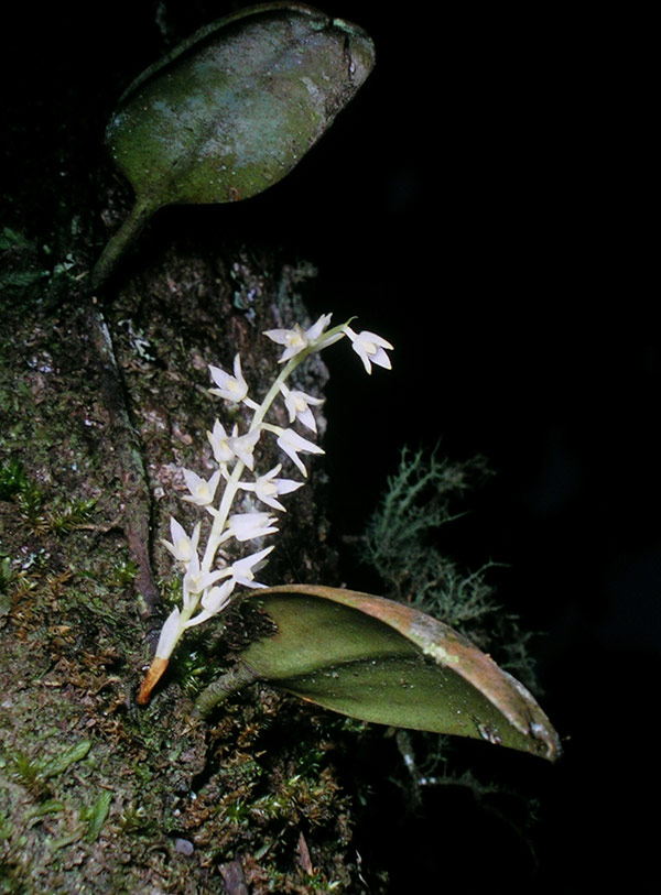 Found in Java at elevations around 1450 to 1650 meters as a small sized, cool growing epiphyte with a long creeping, occasionally branching rhizome with 4" [10 cm] between each, ovate, basally rounded, abruptly contracted into the petiolate base leaf that blooms in the summer on a basal, erect,to 4" [10 cm] long, to 30 flowered inflorescence.