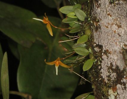 Found in Sabah and Sarawak Borneo in lower montane forests at elevations around 1200 to 2000 meters as a mini-miniature sized, cool growing epiphyte with a creeping rhizome giving rise to close set, prostrate on the rhizome, ovoid, flattened pseudobulbs carrying a single, apical, erect, elliptic to obovate, acute, petiolate base leaf that blooms in the spring on a lateral, 1.6 to 2.2" [3.5 to 5.5 cm] long, single flowered inflorescence with tubular, acuminate, much shorter than the ovary floral bracts.