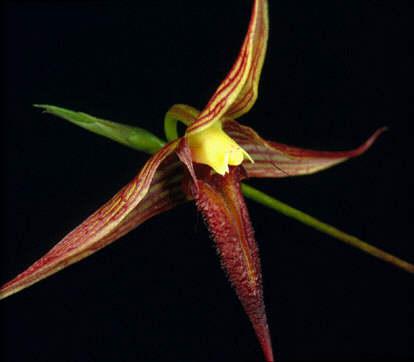 Found in western New Guinea in rainforests on tall trees at elevations of 80 to 400 meters as a small sized, hot growing epiphyte on lower trunks and branches of large trees with mosses and ferns at the root base with small ovoid to conical, smooth becoming rugose with age pseudobulbs 1 to 1 3/4" apart carrying a single, apical leaf and blooms in the fall on a lateral, basal, 22" [to 55 cm] long, longer than the leaf, dark green to maroon brown, to 20" [50 cm] long, successively single, to 12 floweres inflorescence with sheathing bracts and a fractiflex rhachis that carries a single, nodding flower at a time and occurs over several months.